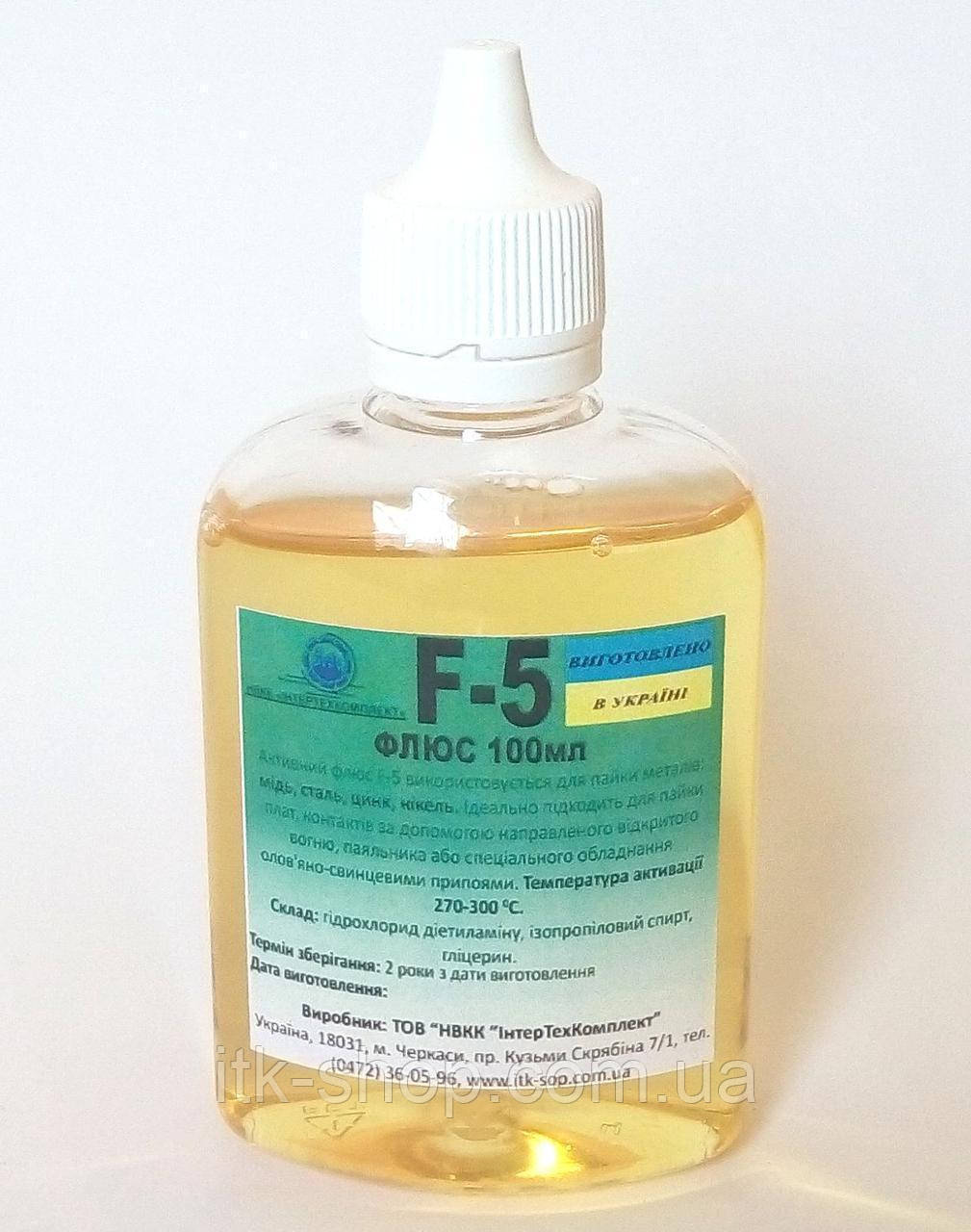 Флюс F-5 має активовані, середньо активні, безкислотні властивості. З його допомогою відбувається попереднє лудіння і пайка радіоелементів, друкованих плат, міді її сплавів, цинку, нікелю/його сплавів, олов'яних покриттів, олов'яно-свинцевих, олов'яно-висмутовых сплавів без попереднього очищення виробів.